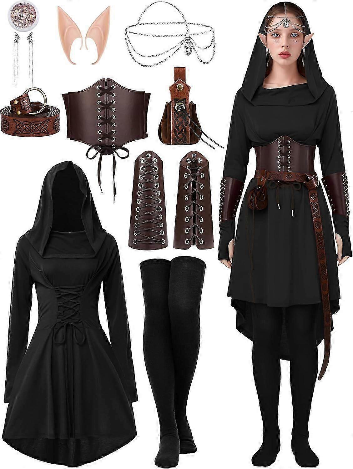Medieval Renaissance Costumes: This meticulous collection includes: 1 hooded dress, 1 elastic corset, 1 belt, 1 pair of leather gloves, 1 leather pouch, 1 pair of long socks, 1 pair of elf ears, 1 elf headpiece, 1 pair of earrings, and 1 face glitter settotaling 10 intricate pieces. Beautifully designed to meet your renaissance costume and cosplay needs for parties and events.