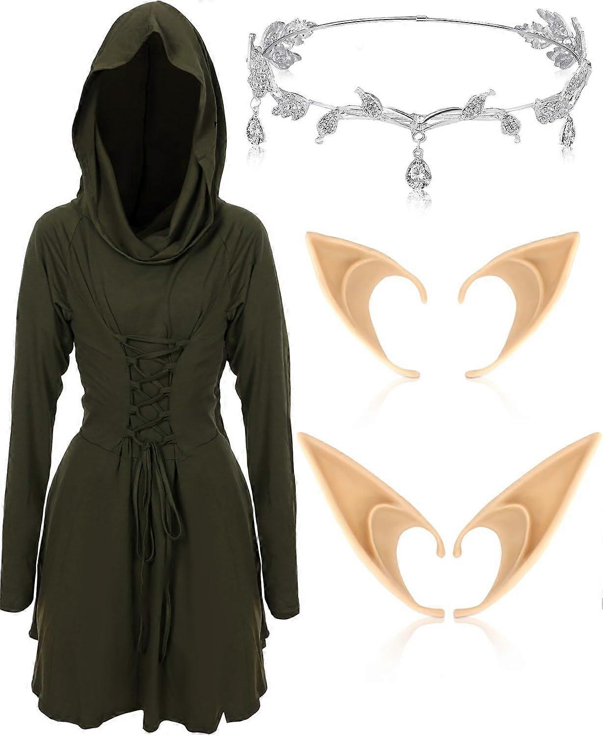 Nice Elf Costume Combination: the package includes an renaissance dress for women, 2 pairs of fairy ears, a rhinestone headpiece, the nice combination can meet your daily use and replacement requirements, you can wear them together or separately Vintage Ren Faire Dress: the viking medieval dress features hem with different lengths, front and back lacing, oversized hoodie and long sleeves with thumbholes, providing you with a nice wearing experience Fairy Ears: the elf ears are suitable for most ears, they can be clipped directly to the ear, mainly made of silicone, soft and reliable suitable for costumes like elves, fairies, elves, goblins and so on; If they are a little loose when worn, you can apply some mascara glue to help fix them, please note that the glue is not included Forehead Jewelry for Women: the rhinestone headpiece is mainly made of alloy and rhinestone, delicate and shining, eye catching and charming, not easy to rust or break, and can stand for your long term usage Wide Range of Applications: the fairy accessories are suitable for cosplay on various occasions, such as Halloween, medieval weddings, cosplay, Renaissance festival, Christmas and Easter, stage performances, themed parties and so on Nice Elf Costume Combination: the package includes an renaissance dress for women, 2 pairs of fairy ears, a rhinestone headpiece, the nice combination can meet your daily use and replacement requirements, you can wear them together or separately Vintage Ren Faire Dress: the viking medieval dress features hem with different lengths, front and back lacing, oversized hoodie and long sleeves with thumbholes, providing you with a nice wearing experience Fairy Ears: the elf ears are suitable for most ears, they can be clipped directly to the ear, mainly made of silicone, soft and reliable suitable for costumes like elves, fairies, elves, goblins and so on; If they are a little loose when worn, you can apply some mascara glue to help fix them, please note that the glue is not included Forehead Jewelry for Women: the rhinestone headpiece is mainly made of alloy and rhinestone, delicate and shining, eye catching and charming, not easy to rust or break, and can stand for your long term usage Wide Range of Applications: the fairy accessories are suitable for cosplay on various occasions, such as Halloween, medieval weddings, cosplay, Renaissance festival, Christmas and Easter, stage performances, themed parties and so on