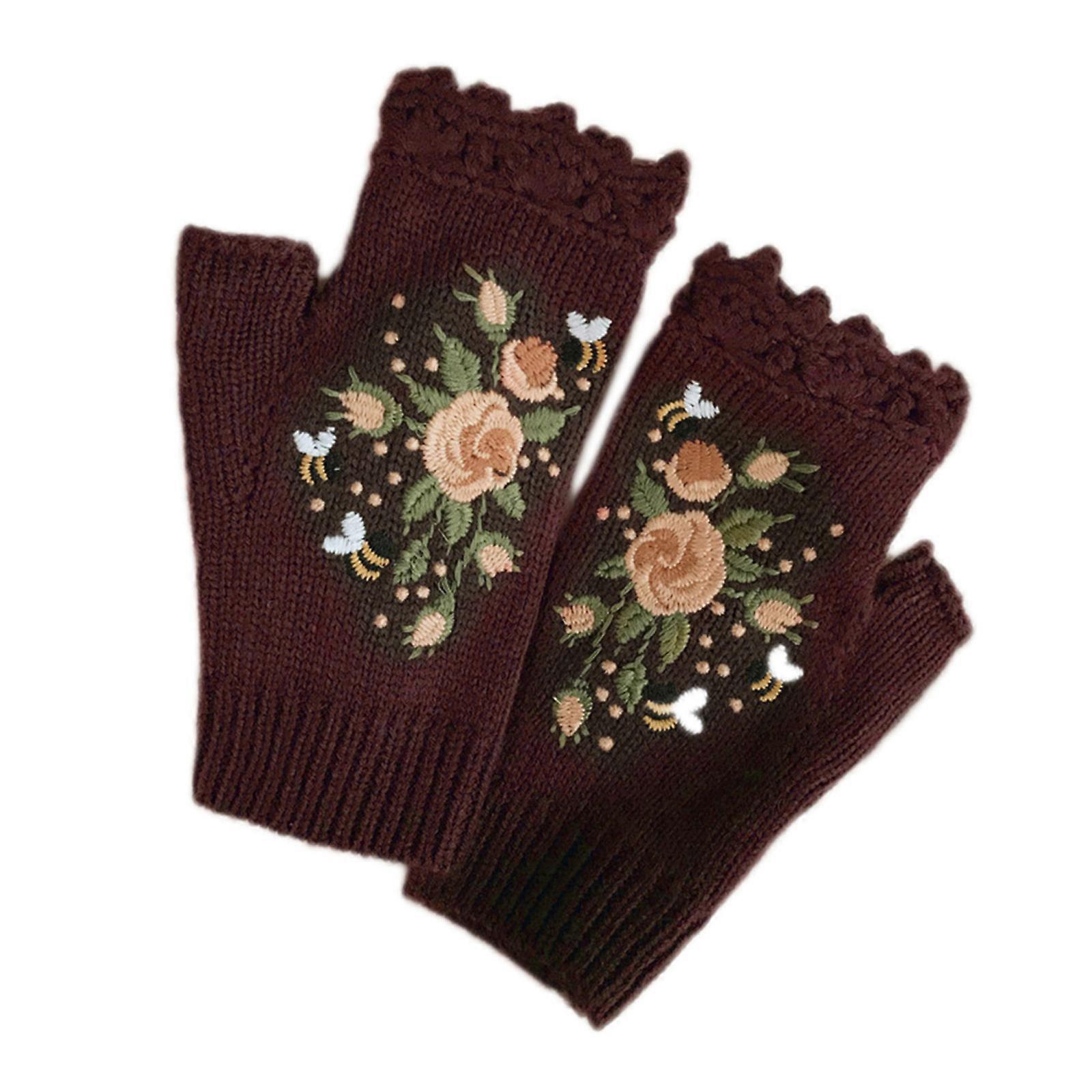 Women Winter Crochet Knitted Fingerless Gloves Sweet Colorful Floral Bee Embroidery Thumbhole Texting Mittens Arm Warmer yellowish brown