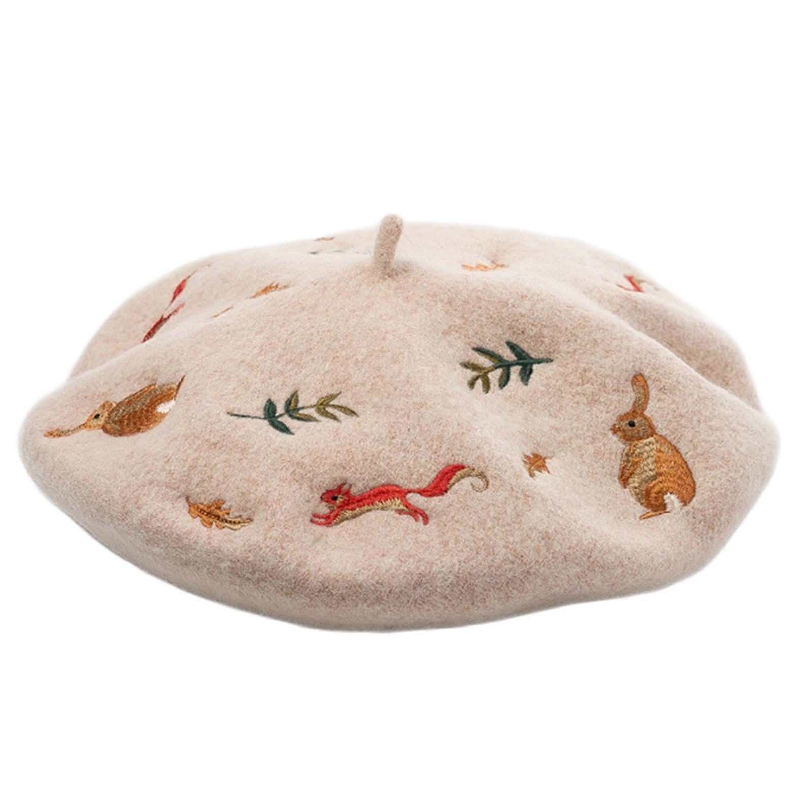 Women Winter Faux Wool Beret Cap Cartoon Rabbit Squirrel Embroidery Painter Hat apricot