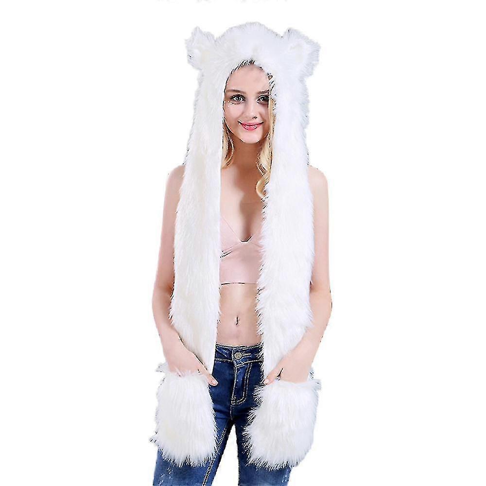 Women Winter Warm Fluffy Animal One-piece Hooded Faux Fur Scarf Hat Cap Mittens Gifts T