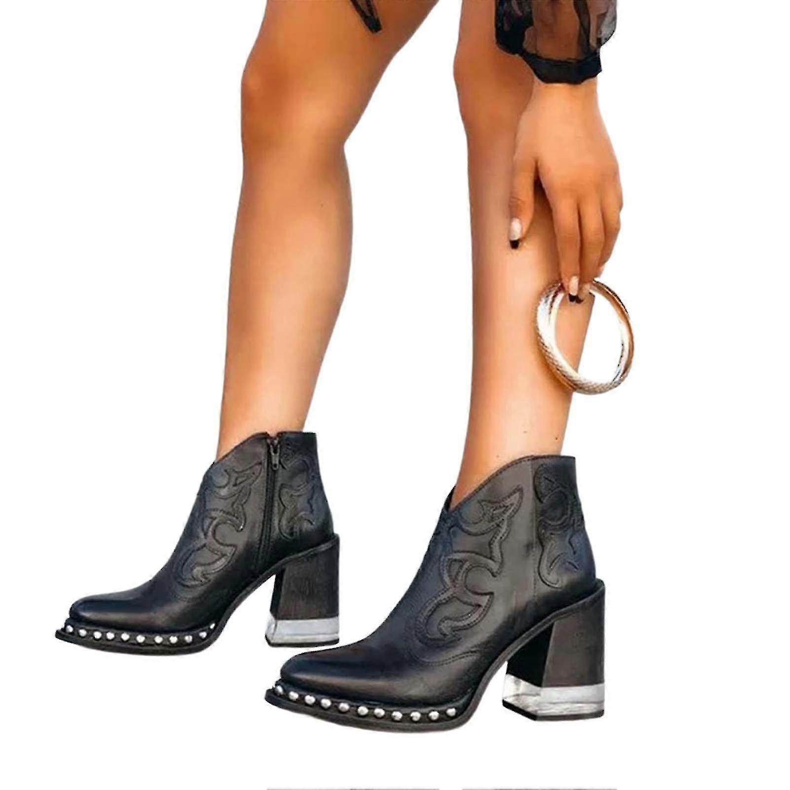 Women Embroidery Ankle Boots Retro Block Heels Shoes Leather High Heel Short Boots