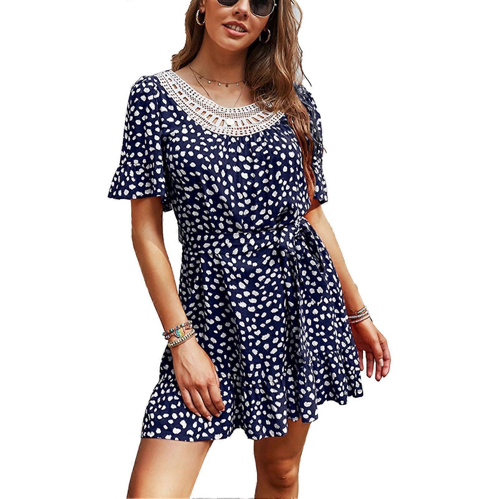 Women Short Sleeve Lace Paneling Dress Summer Casual Dress with Flowy Hem Loose Cuff for Daily Wearing Dark Blue L