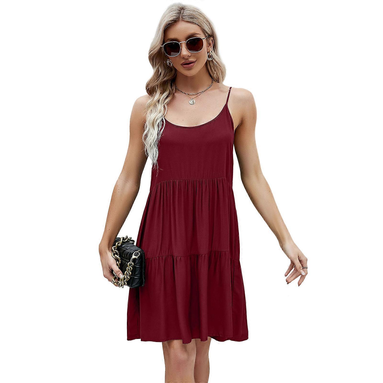 Women Summer Spaghetti Strap Dress Solid Sleeveless Backless Tie Up Causal Beach Cover Up Dress Burgundy XL