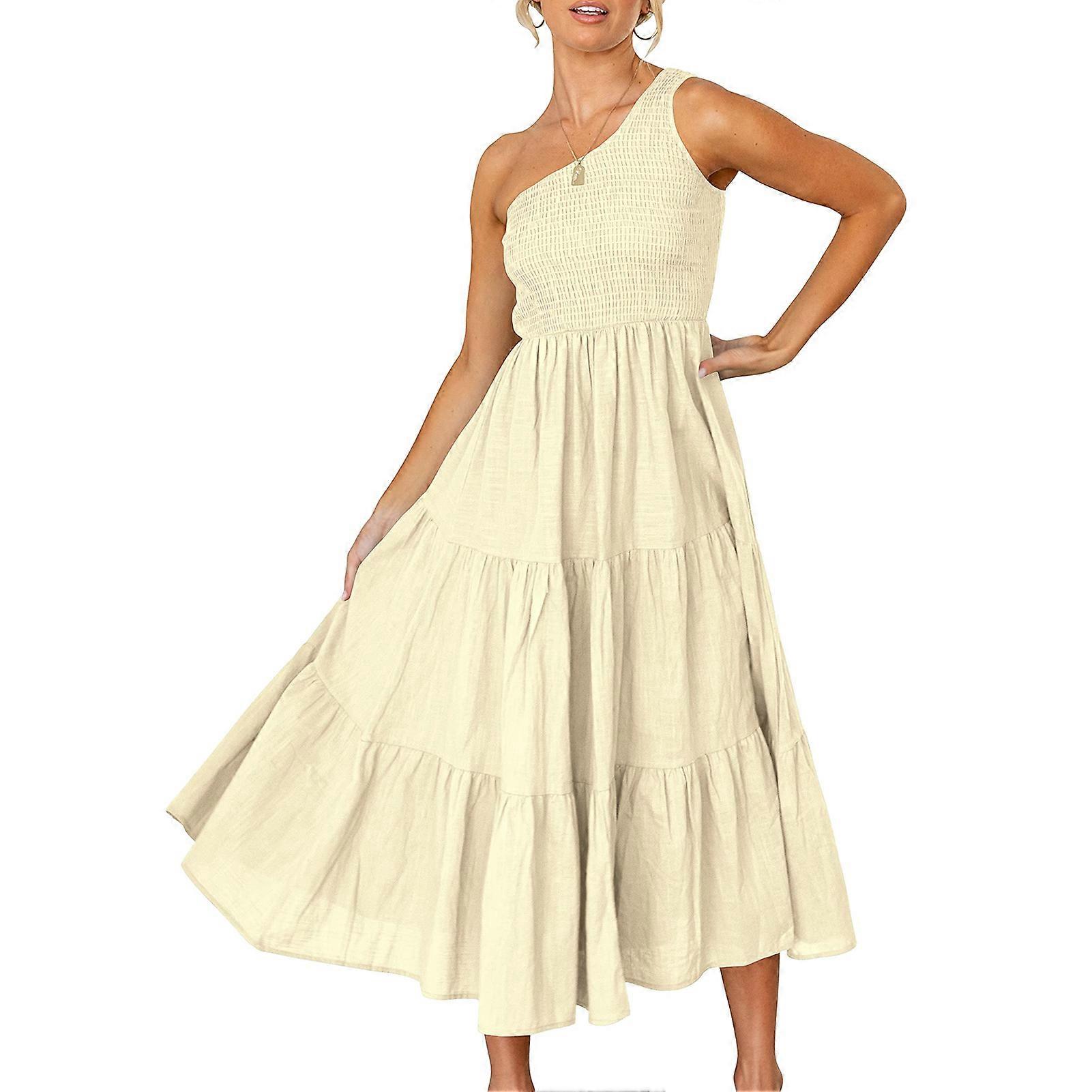 Women Summer Bohemian Party Maxi Dress One Shoulder Sleeveless Tiered Ruffle Flowy Skirt for Beach Wedding Club Holiday Apricot M