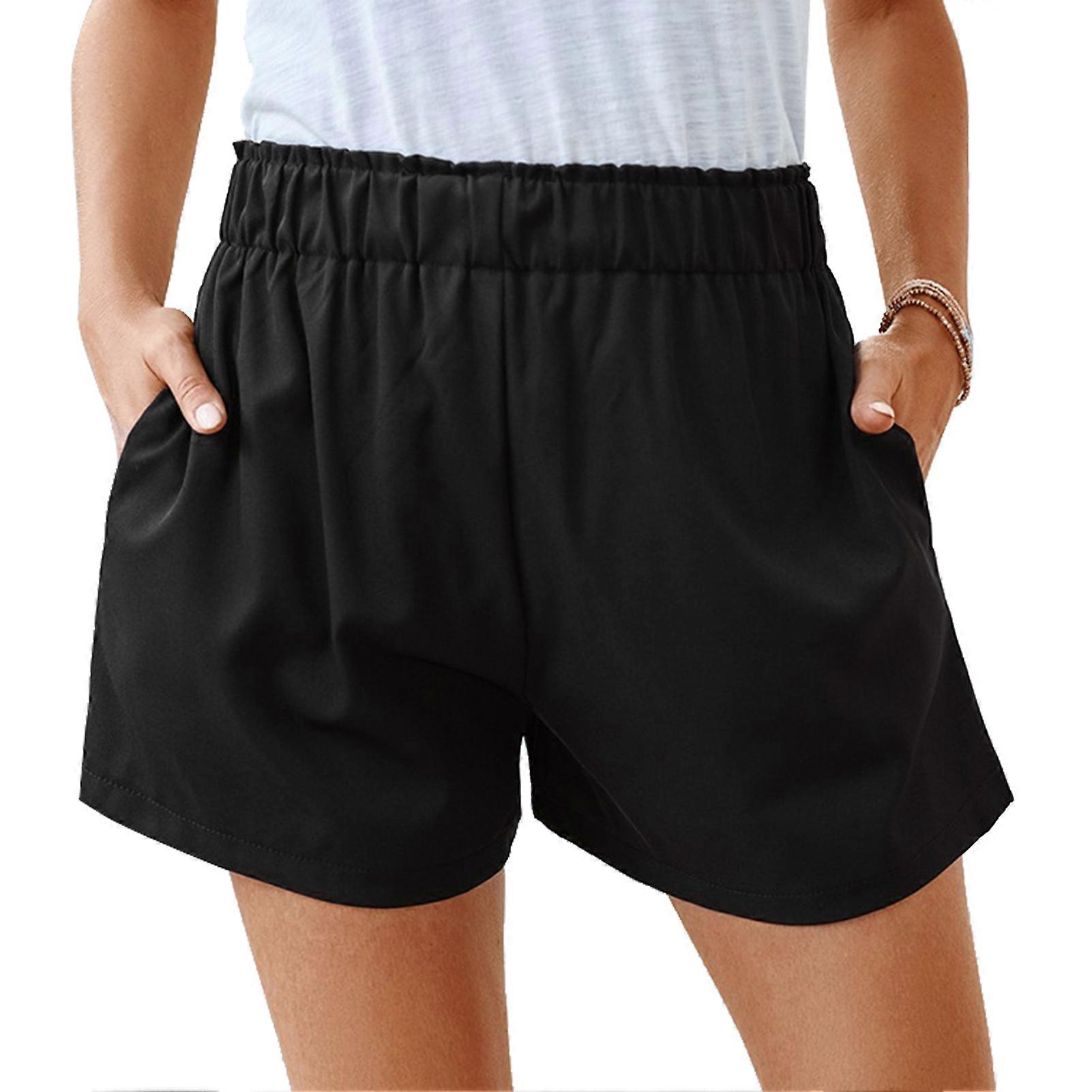 Women Summer Wide Leg Shorts Fashionable Solid Elastic High Waist Casual Shorts with Side Pockets Black M