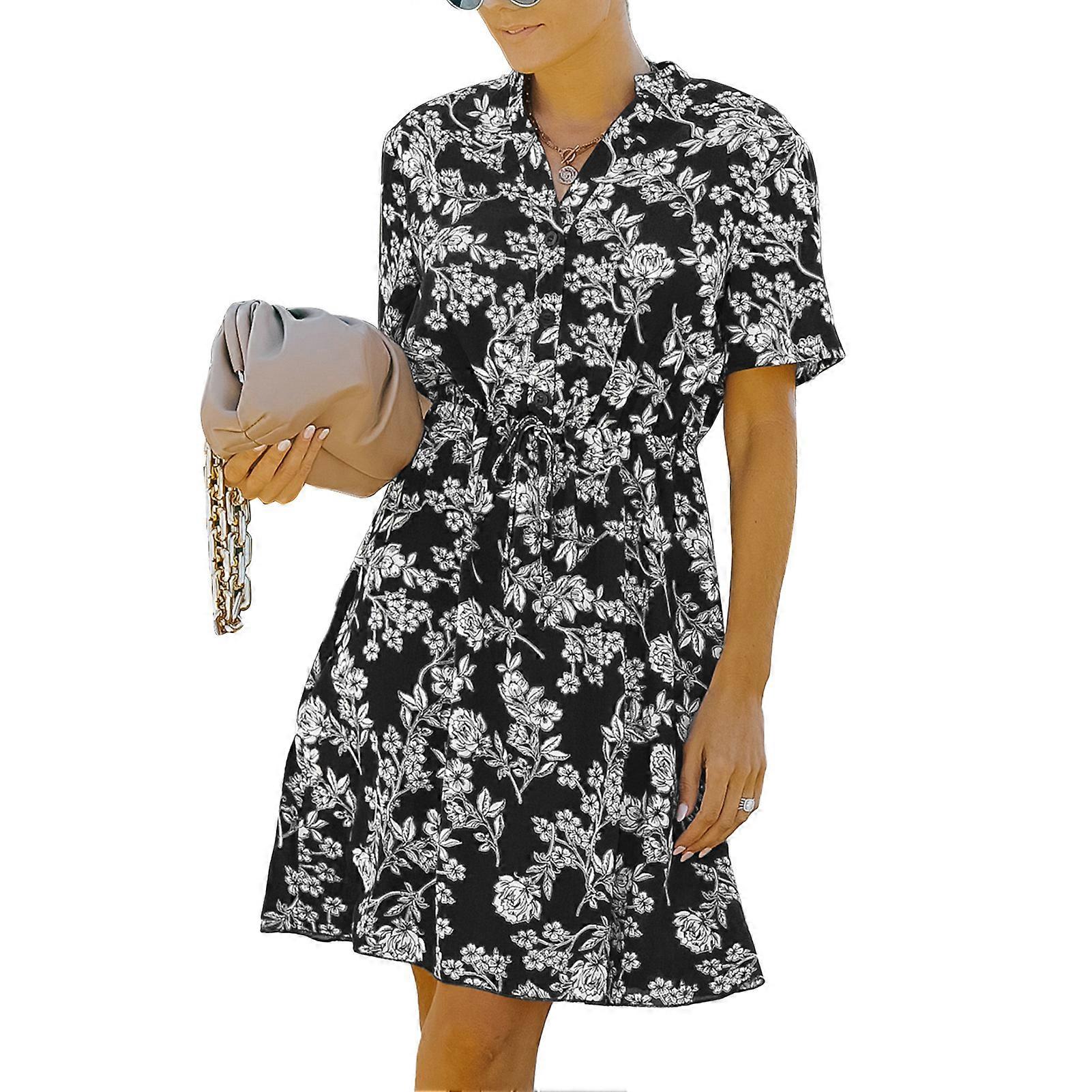 Women Summer V Neck Short Sleeve Floral Dress Casual Button Down High Waist A Line Dress with Belt Black S