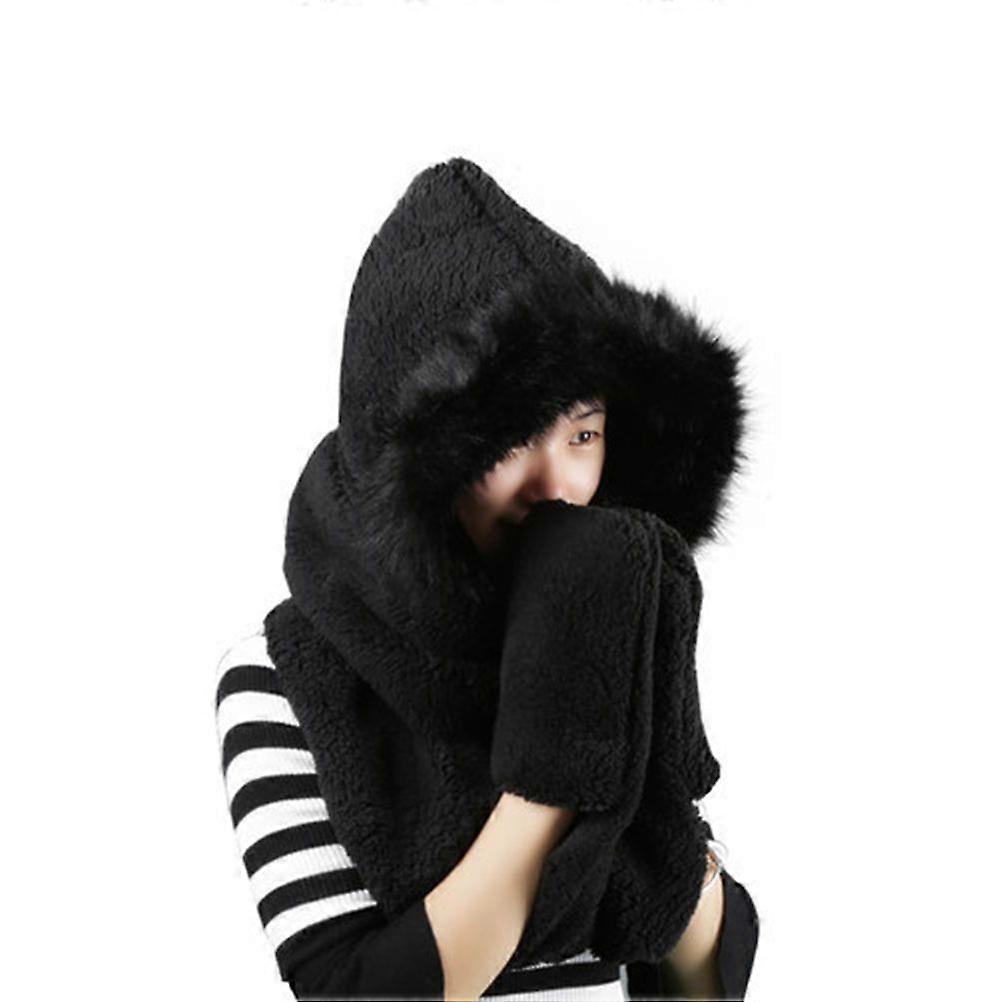Women Girl Winter Warm Thickened Plush Three-Piece Hat Scarf Gloves (Black)