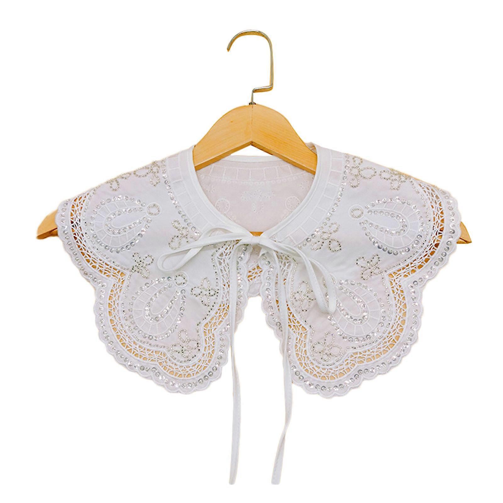 Women Wavy Scalloped White Shawl Lapel Fake Collar Shiny Sequins Beaded Embroidery for Butterfly Floral Scarf Lace-Up Ca