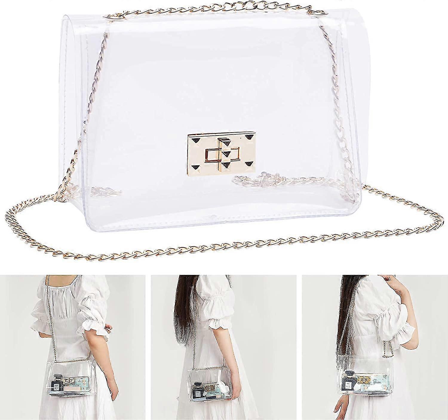 Get Through Security Easily: More and more places now require you to bring clear bag for security reasons. The clear purse can help you get through security check easily and quickly, you can see everything in the purse at a glance. Premium Material: Our clear purses are made from premium thick PVC material with no unpleasant smell, but it's not so thick that it feels stiff and uncomfortable. These clear purses are meant to keep everything dry even if it starts to rain Perfect Size for Necessities: Our clear purse measures 8.3x5.9x3.0 inch, not too big but enough if you only need to take the basics like a lipstick, cellphone, small wallet, keys, sunglasses, portable charger and any other things you need. Trendy & Functional: Offering convenient visibility and goes-with-anything style, our clear purse for women is designed with gold-tone metal hardware and 24 inches long gold chain strap, easily hangs across your shoulder and body. It's more practical and stylish than you thought Multi-Purpose for All Situations: The clear crossbody purse is completely stadium approved. You can go with this clear purse to attend a concert, sporting event or any other large-scale public gathering. It's a smart investment for anyone