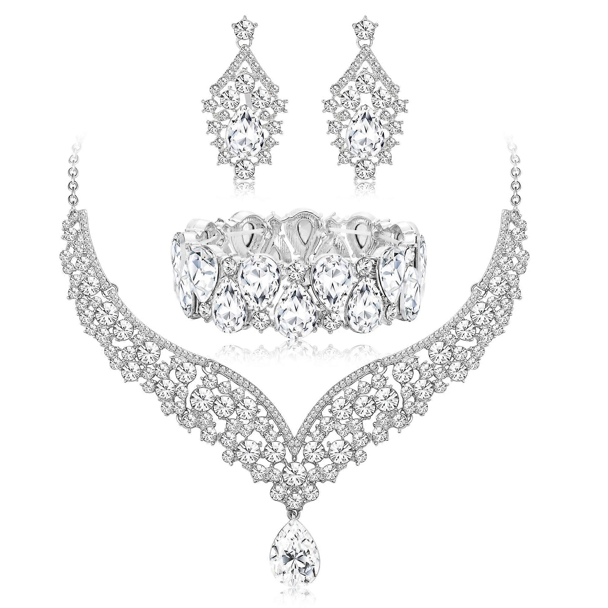 Crystal Wedding Bridal Jewelry Set for Women - Silver Rhinestone Necklace, Earrings, Bracelet, Elegant Ball Style