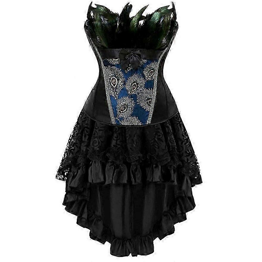 Women Corset Set Peacock Embroidery Overbust Corset Floral Lace Skirt Gothic Feather Shapewear Burlesque Costume