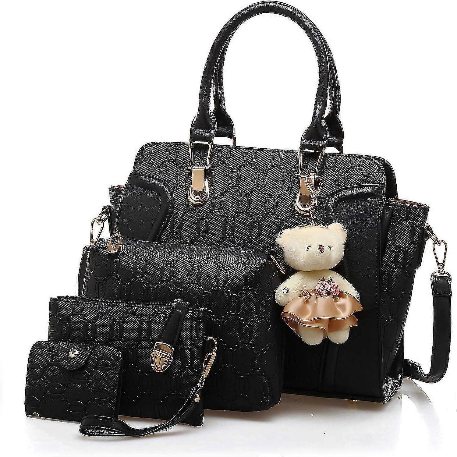 The exquisite bear matches perfectly with the handbag, elegant and beautiful. The shoulder strap of the main handbag is detachable, you can use it as a handbag or a shoulder bag. materials: artificial leather (PU leather), fabrics, clear texture, waterproof and tear resistant. The sewing thread perfect and neat making bag more beautiful and refined. The portable part is filled with PE cotton for comfort. Size: This 4-piece handbag contains a shopping bag, a shoulder bag, a clutch bag and a purse. The size of the shopping bag is 12.5 x 5 x 14 inches. The shoulder bag measures 8.7 x 2.6 x 5.7 inches. The clutch bag is 7.3 x 4.3 inches. Large capacity: plenty of space for your everyday items, iPad, eyewear, books, umbrellas, wallets, cell phones and. Whether work, shopping, leisure, travel,parties or office - this bag is stylish and practical. It is a good choice for Christmas, Valentine's Day, birthday, Mother's Day, New Year, Thanksgiving gift.The portable reinforcement structure, rivet connection and reinforcement structure increases the load capacity.
