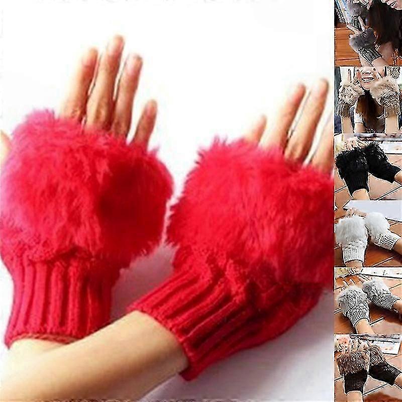Women's Winter Warm Knitted Fingerless Gloves with Faux Fur Accent