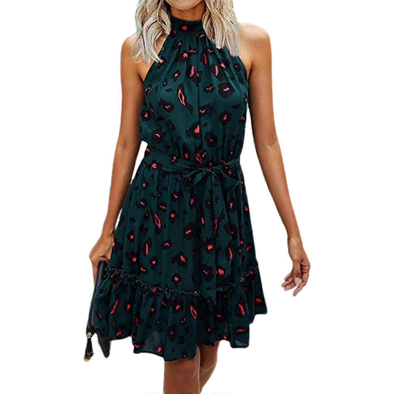 Women's Summer Floral Print Halter Neck Sleeveless Sundress with Lace-up Detail & Waist Tie, Off Shoulder Dress for Girls, Dark Green Size M