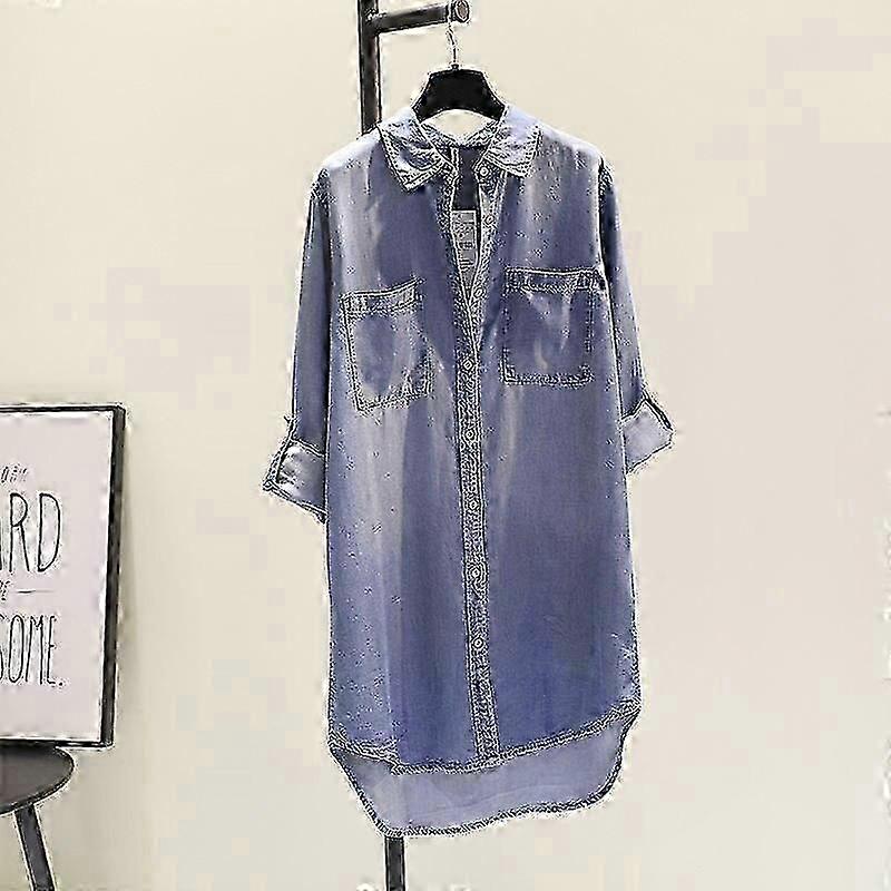 Spring Denim Pocket Long Sleeve Dress for Women - Casual Fashion with Medium Length and Loose Fit 24120