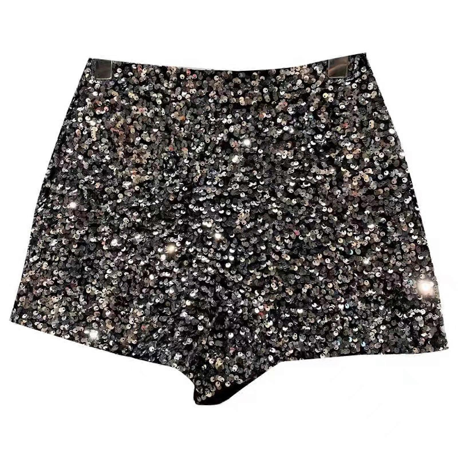 Women's Summer Sequins Shorts High Waist Hot Pants Sparkly Clubwear Night Out Skort Silver XL