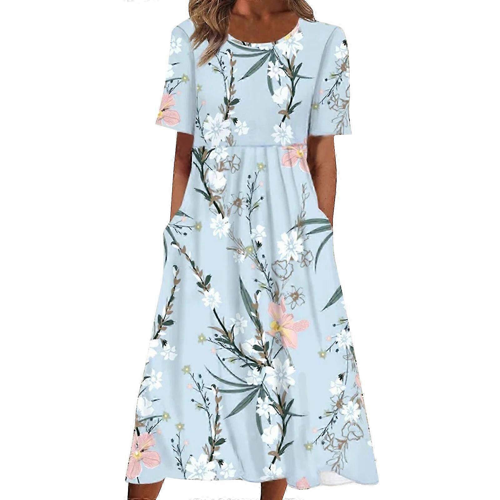 Women's Floral Print Summer Dress - High Waist Casual Short Sleeve Round Neck Flowy Midi Dress in Light Blue Flowers Size XL