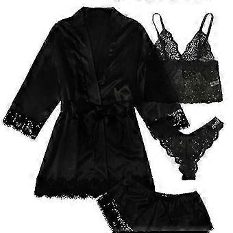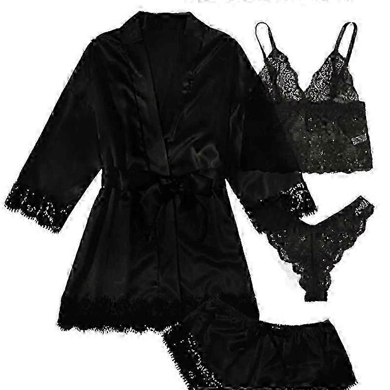 Women's 4pcs Sleepwear Satin Floral Lace Trim Cami Pajama Set