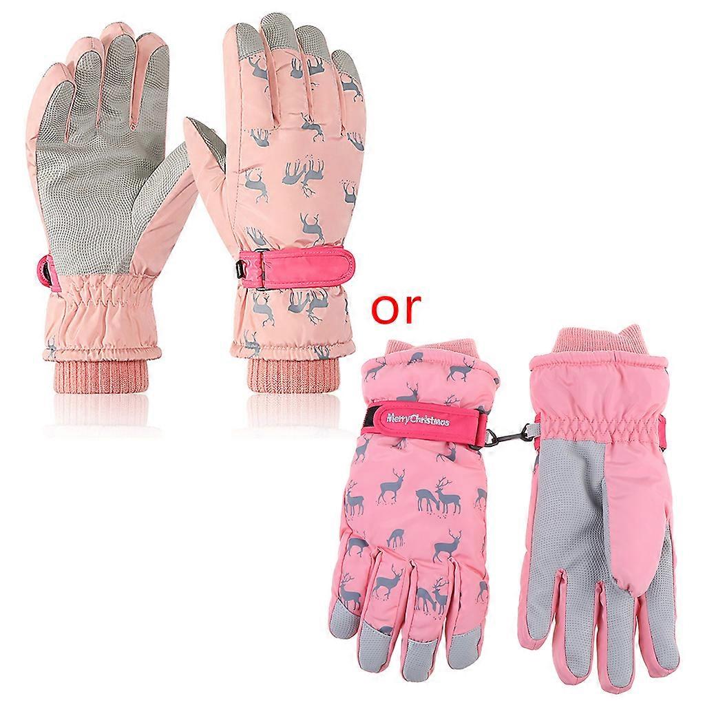 Women Men Winter Waterproof Snow Ski Gloves Cartoon Deer Print Thermal Plush Lined Adjustable Outdoor Snowboard Mittens PK