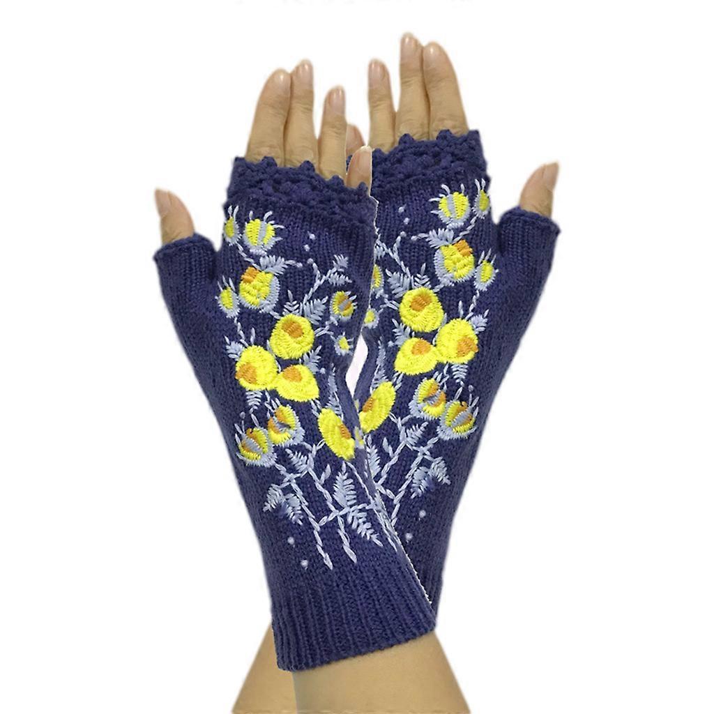 Women Autumn Knitted Lengthen Wrist Fingerless Gloves Sweet Small Yellow Floral Embroidery Crochet Thumbhole Texting Mittens Arm Warmers Royal Blue