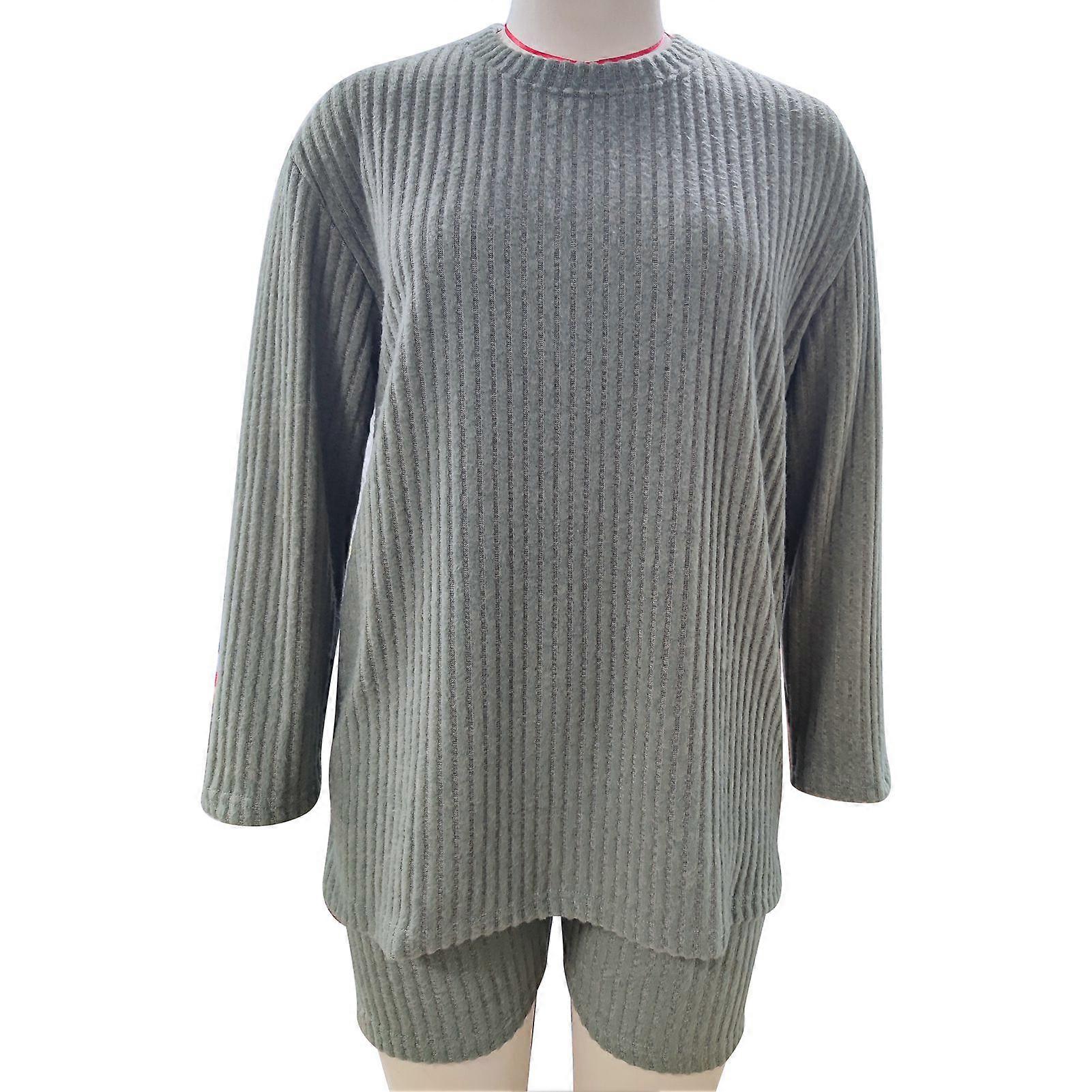 Women Long Sleeves Top Shorts Set Round Neck Elastic High Waist Casual Two Piece Brushed Outfits OD Green M
