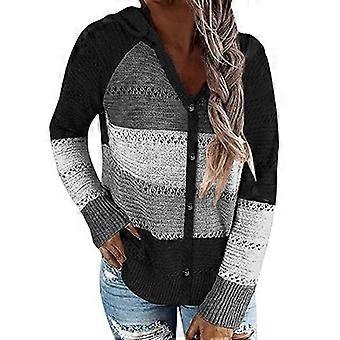 Women Long Sleeves Hoodies Cardigan Color Block Stripes Hollow Out Knitted Sweater Coat Button Down Loose Drawstring Sweatshirt Outwear Plus Size S-5X