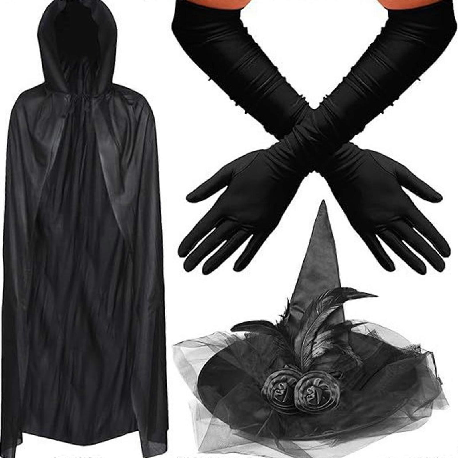 Women Witch Hooded Cape Cloak Costume Witch Hat Long Gloves Adult Halloween Witch Costume Accessory for Women Cosplay Black