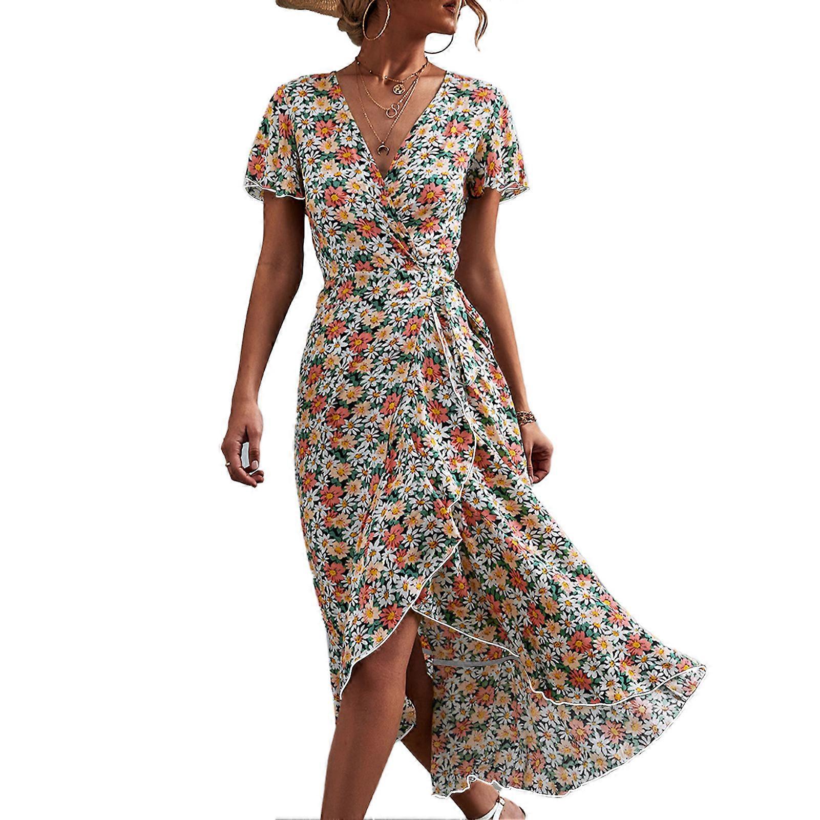 Women Floral Wrap Dress V Neck Waist Belted Ruffle Sleeve Asymmetrical Hem Summer Long Dress Black Red L