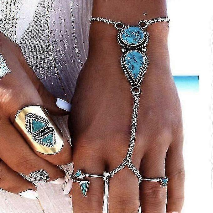 Women Boho Retro Celebrity Turquoise Slave Chain Ring Bracelet Hand Harness-antique Silver