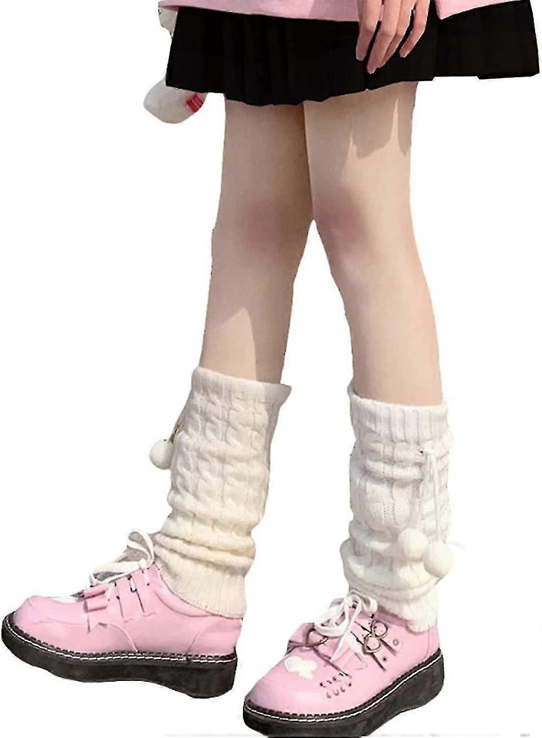 Women Girls Japanese Kawaii Knitted Long Crochet Wool Ball Leg Warmers Knee High