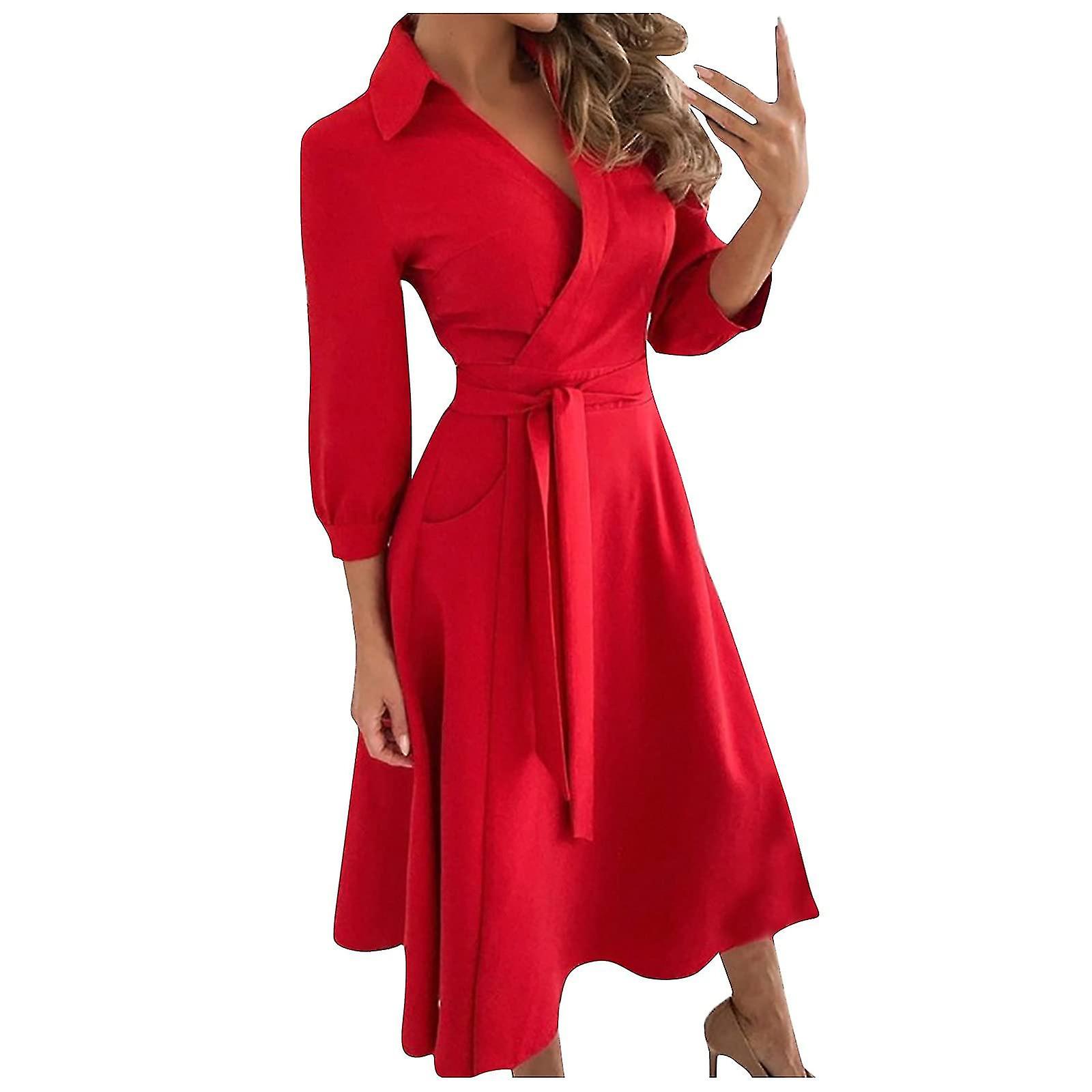 Women V Neck Lapel Dress Seven Part Sleeve Belt Dress Spring Elegant Casual Work Wear