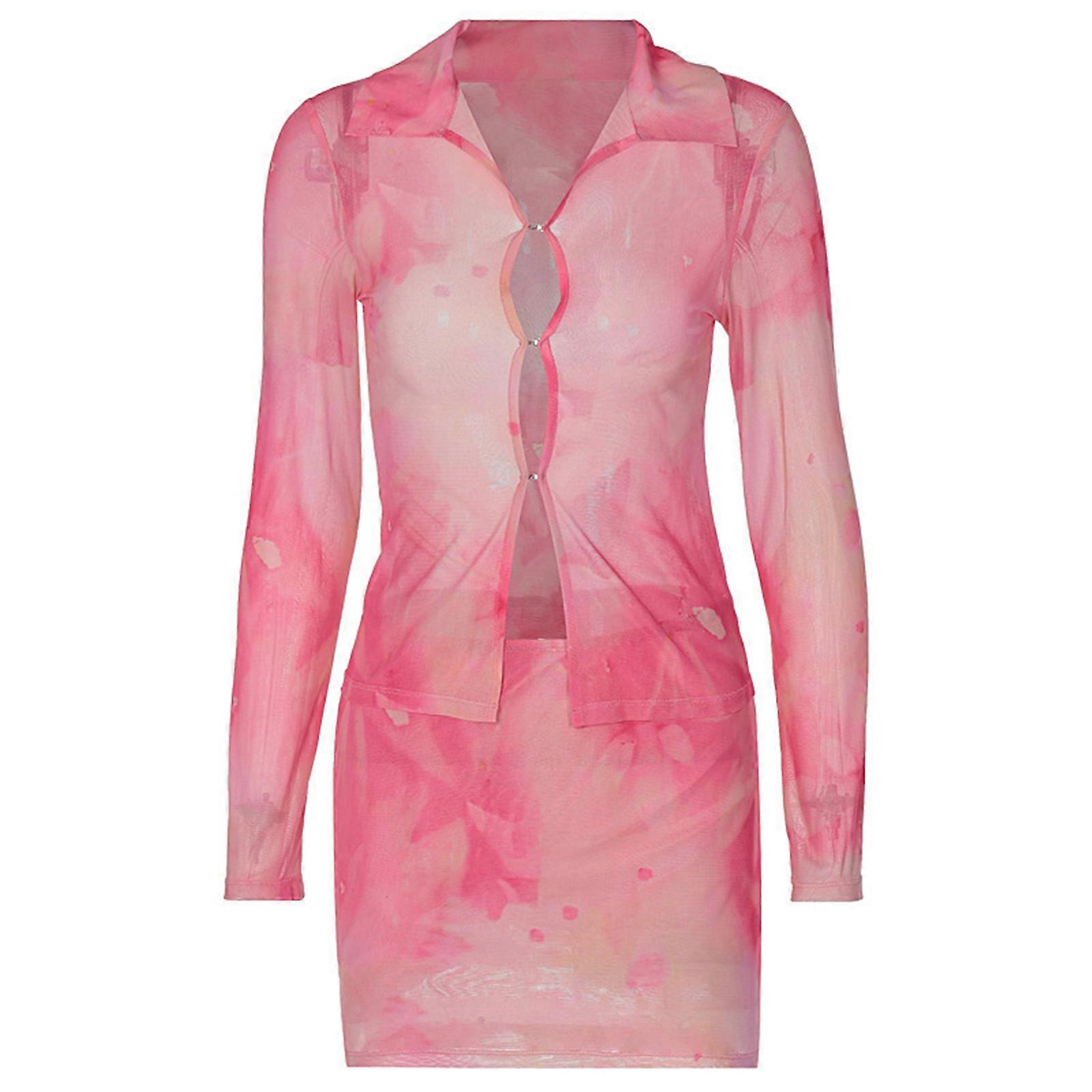 Women 2Pcs Mesh Gradient Outfit Long Sleeve Lapel Cardigan Blouse Mini Skirt Pink S