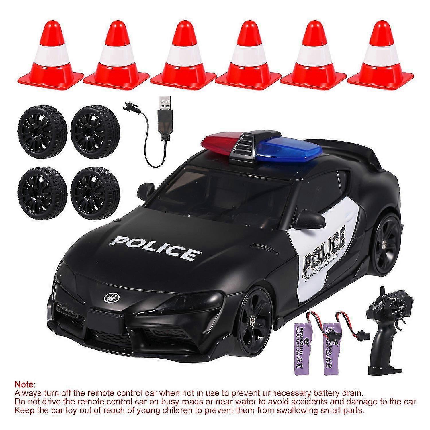 Feature: 1. 2.4GHz Remote Control: Experience the excitement of remote control with our toy car, equipped with 2.4GHz technology for seamless operation and minimal interference during playtime. 2. 4-Wheel Drive: The strong 4-wheel drive system ensures effortless drifting and exciting performances, making this race car toy perfect for both beginners and experienced young racers looking to showcase their skills. 3. Interchangeable Tires: Featuring interchangeable tiresincluding drift wheels and racing wheelsthis versatile remote control car adapts to various terrains and driving styles, enhancing the overall experience for kids. 4. Durable Battery Life: Powered by a robust 3.7V 500mAh lithium battery, our remote control police car charges in only 80 minutes and allows for continuous playtime of 20 minutes, providing prolonged enjoyment. 5. Perfect Gifts: This police car toy sparks creativity and adventure in young minds, making it the perfect present to ignite a passion for motor skills development and racing excitement. Specification: Item Name: Remote Control Police CarMain Material: ABSCar Battery: 3.7V 500mAh Lithium Battery (included)Remote Controller Battery: 2 * 1.5V AA Batteries (not included)Charging Time (Single Battery): 80 minutesOperating Time (Single Battery): 20 minutesRemote Control Distance: 50 metersProduct Color: BlackProduct Size: 19.3*8.7*5.7cm/7.6*3.43*2.24inch (Style B) Package List: 1 * Car1 * Remote Control2 * Rechargeable Battery4 * Racing Wheel6 * Barrier1 * USB Charging Cable