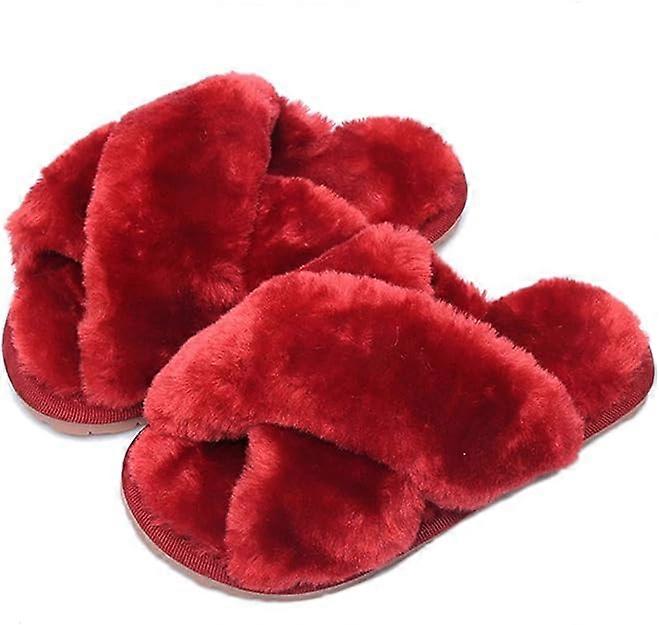 Girls Fluffy Slippers for Kids Cute Fuzzy Slippers Open Toe Warm Fur Slides Cross Band Plush Slip on Indoor Slippers US Women 5-5.5, EU 36-37 red