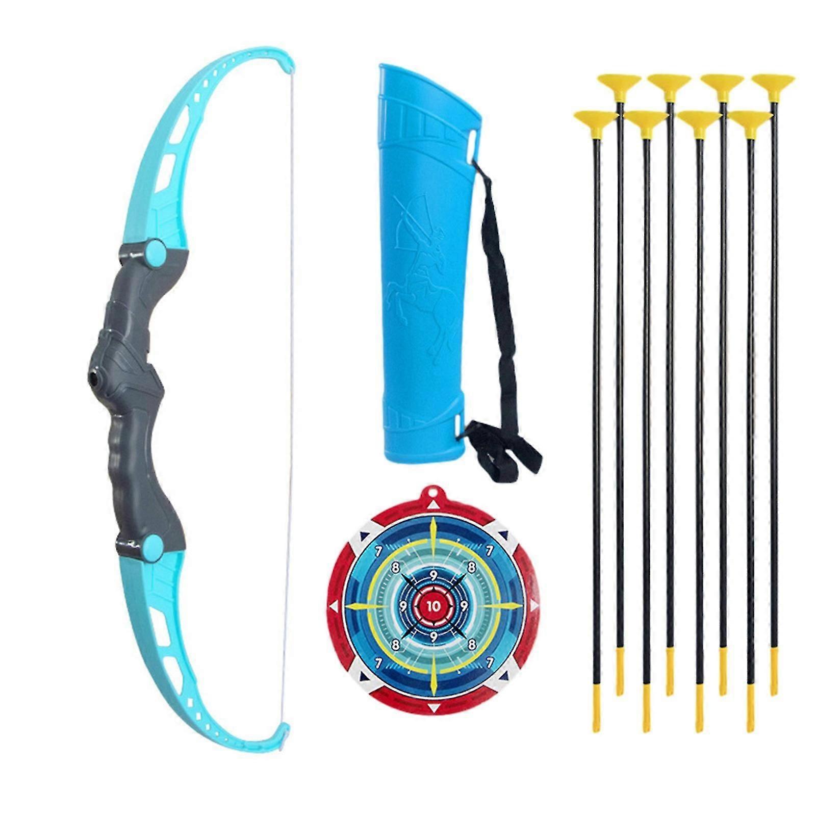 Kids Bow And Arrows Set With 8 Suction Cup Arrows, Targets & Dorlach, Indoor And Outdoor Toys For Children Boys Girls Features: Aiming & Firing Right Away Package contains 1 main bow body, 8 suction cup arrows,targets and dorlach. More Attractive Outdoor Toy - The arrows set is one of the favorite outdoor toys for kids. Educational & Enjoyment - Kids will practice their accuracy skills, hand-eye coordination, fine motor skills and aimming right on targets in more interesting and interactive way. Durable Design - Premium elasticity material of bows and arrows ensure its durable features. It has a safe surface, which makes it safe for children. Sucker can be adsorbed on the glass, wall, and targets Gift Ideas - Easy to wear dorlach with strap, you can enjoy it even travelling or camping. Perfect for kids/ boys/ girls birthday party, indoor outdoor activity, christmas gifts toys for kids, boys christmas gifts, birthday gifts, Thanksgiving gifts, Halloween gifts.This is a safe and ideal outdoor activity for everyone! Product Description: Product: Children's Bow and arrows Set Material: Plastic Color: blue Bow size: 52cm long Arrows size: 41 centimeters long Packaging size: 52x15x3cm/20x5.9x1.2in Packaging weight: 320g/0.7lb Package Contents: 1 x bow 8 x arrows 1x targets 1x dorlach