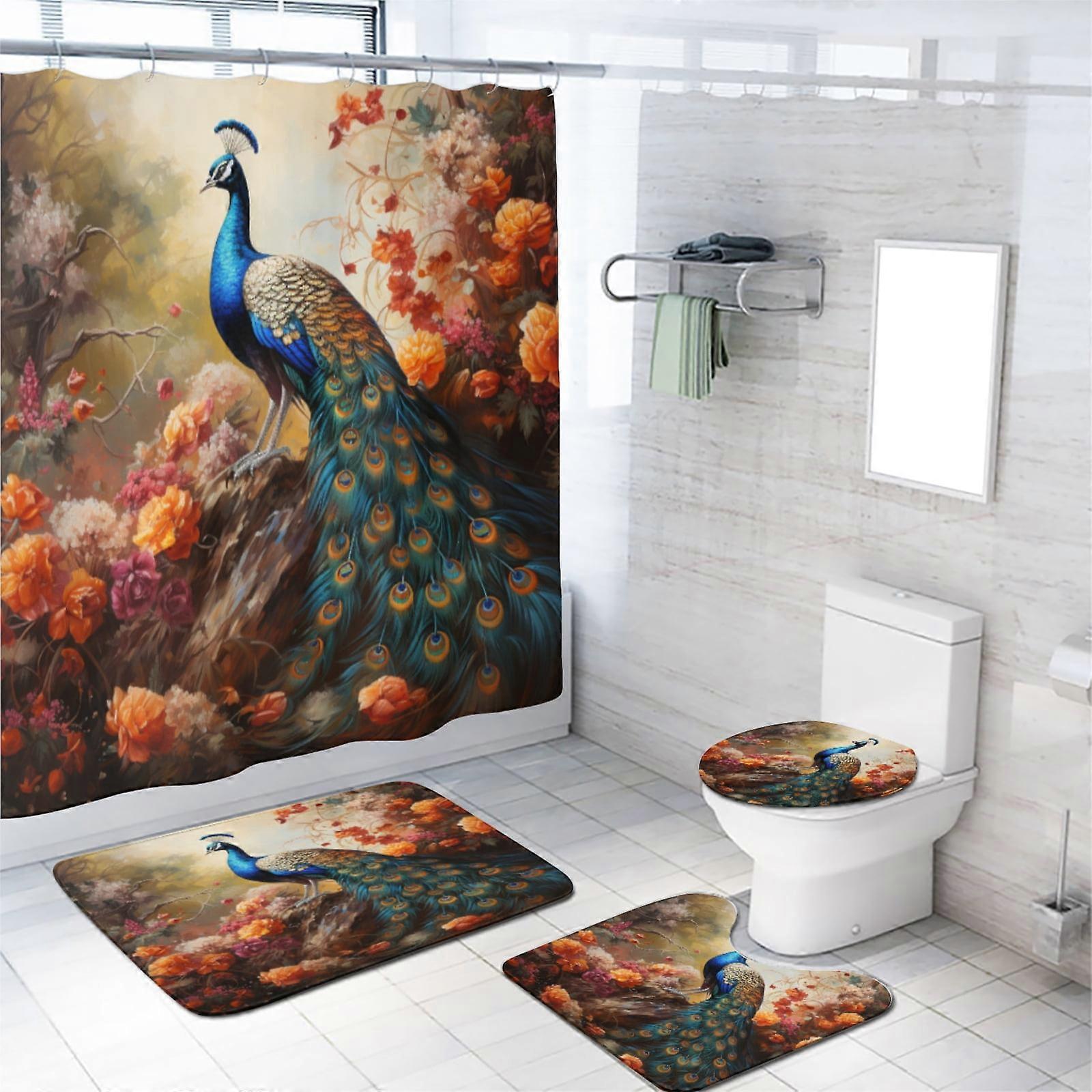 Peacock Shower Curtain Set with Non-Slip Bath Mat & Toilet Lid Cover, Retro Elegant Blue Feather Design, 72x72 Inch Bathroom Decor