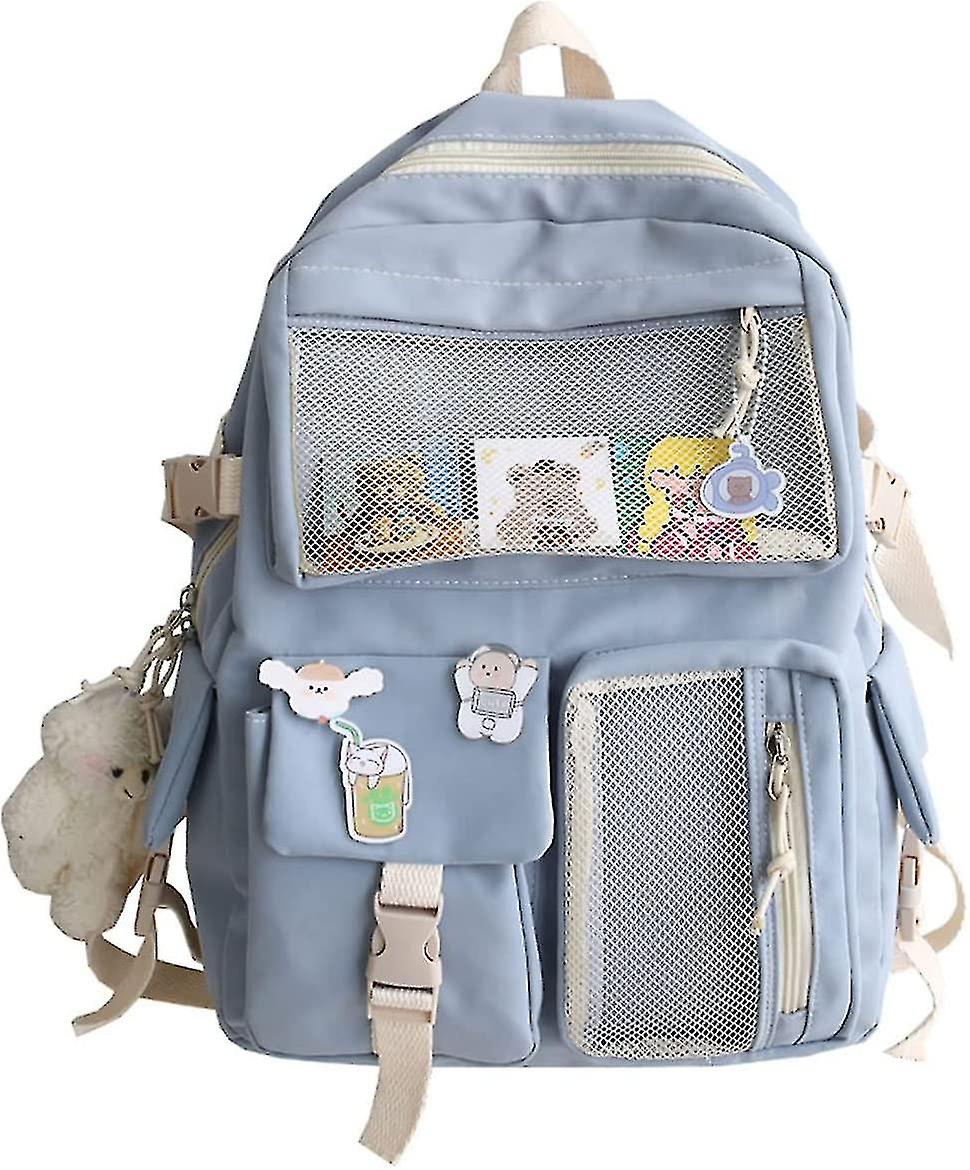 Material: Our backpacks are made of waterproof nylon canvas, smooth and durable, and light in weight. The size of our backpack: 32*11*43 cm/12.6 inches*4.3 inches*16.9 inches? Kawaii backpack: very suitable for schools, gyms, sports, travel, luggage, hiking, camping and daily outings, especially suitable for animation expos and animation exhibitions. Large space: Our kawaii backpack is very spacious, very suitable for female students to carry books and stationery, very feminine. Backpack accessories: 3 pins, 1 decoration and 3 cards are very cute and suitable for girls. Color: Blue