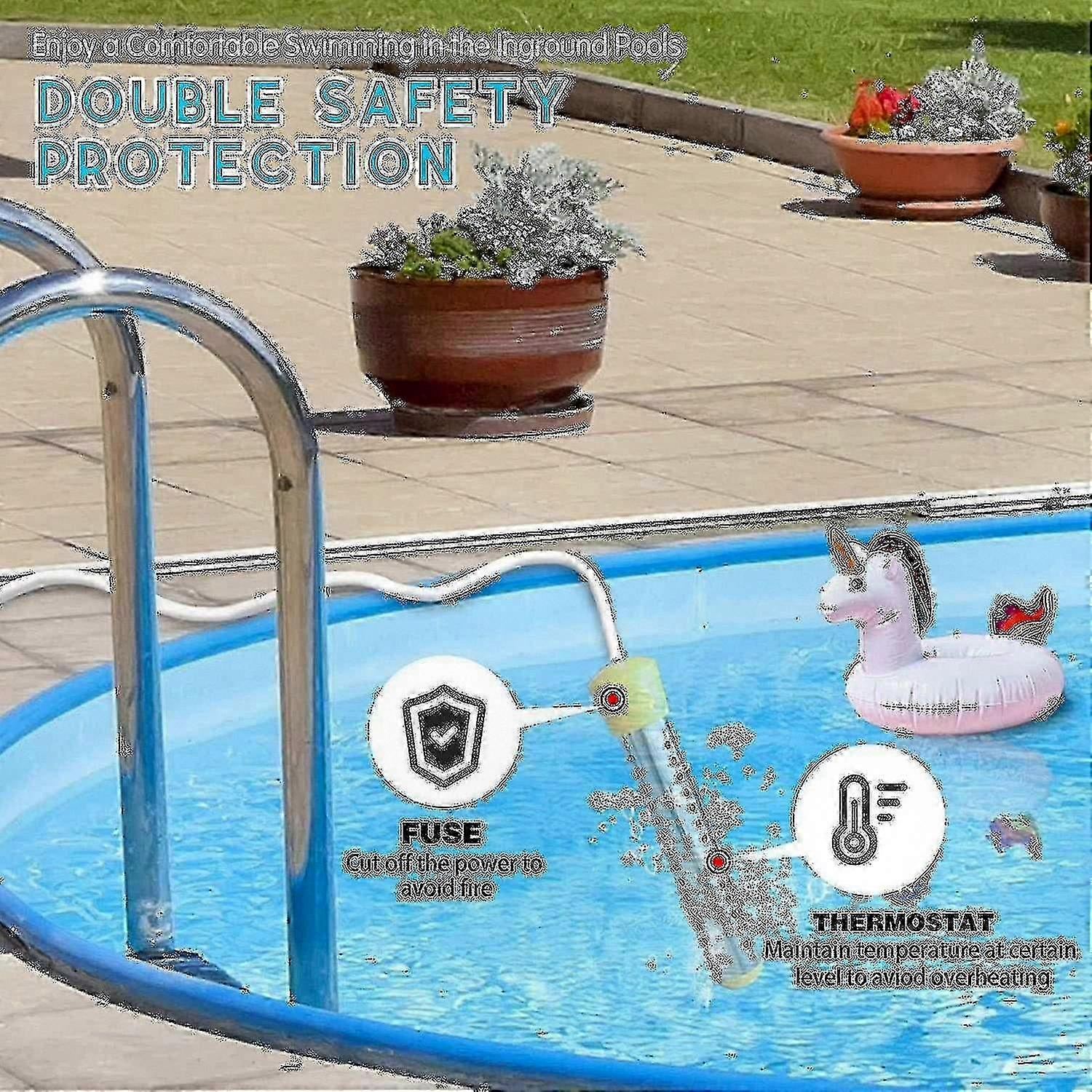 DoubleSafetyProtectionInresponsetocustomerneeds,wehaveenhancedtheelectricpoolheaterwithbuiltinthermostatcontrolandafuse.Theheaterwillautomaticallystopheatingoncethewaterreachesaspecifictemperature,maintainingitsteadily.Thefuseisdesignedtocutoffthepowertopreventfirehazards,offeringyoudoublesafetyprotectionwhileyouenjoyarelaxingsoakathome.FastHeatingThishighpower1500Welectricpoolheatercanheat5gallonsofwaterinjustminutes,conservingenergyandsavingyoumoney.Theupgradedheaterprovidesanimprovedexperience,allowingsmallchildrentoplaycomfortablyinaningroundswimmingpoolfreefromcoldwater.AntiscaldingCorrosionResistanceTheswimmingpoolheaterfeaturesastainlesssteelprotectiveguardthatresistscorrosion,effectivelypreventingdirectcontactoftheheatingelementwiththehumanbody.BothsidesaresecuredwithmechanicalfastenersandABglueforstrongsealingandenhancedsafety.Itisdurableandsolvestheissueofhavingnohotwaterforanextendedperiod.SimpleOperationThiselectricpoolwaterheaterisuserfriendlysimplysubmergeitcompletelyinwaterandconnectittoa120Vpowersupply.Itisequippedwithcopperwiringthatefficientlytransfersheattothewater.NoteUnplugtheheaterbeforeremovingitfromthewater.WidelyUsedTheheaterissuitableforabovegroundswimmingpools,buckets,washbasins,bathtubs,constructiontasks,animalhusbandry,carwashing,andmore.Itslightweightandcompactdesignmakeiteasytocarrywhilecamping.Itcanalsoserveasastandbywaterheaterforacombinedboiler.