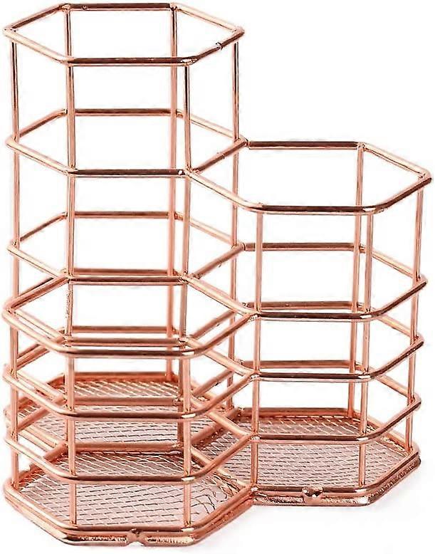 Material: made of metal, it is sturdy and durable, and the stylish and creative golden makeup brush tube is made of high quality alloy coating without discoloration and deformation. Multiple uses: suitable for storing stationery, makeup brushes, eyeliner, toothpaste, kitchen utensils. Wide applications: this slim storage office shelf is suitable for many occasions, it is ideal for office, school and home study purposes and decorations. Charming colours: the pen holder is modern rose gold, stylish and elegant, decorated with offices and families. 3 compartments organiser: the hexagonal pen holder can be used for pencil, marker, gel pen, makeup brush, scissors, make your desktop neat and tidy. Size: 12.5*12*6cm
