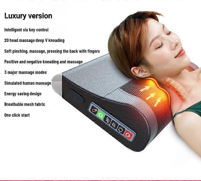 Product attributesApplicable areas: neck, waist, legs, backAppearance shape: rectangular trapezoidal shapeMore than 6 massage headsGear 3Functional timingPower mode plug-in versionMassage techniques: hot compress, airbags, kneadingSpecifications: Luxury version - Intelligent six button, Luxury version - Intelligent six button+airbag traction, Elite version-Intelligent six button+airbag traction+small pillow mugwort hot compress guide, fully equipped - intelligent six button+Airbag traction+small pillow mugwort hot compress+cape, basic styleFabric PU leather