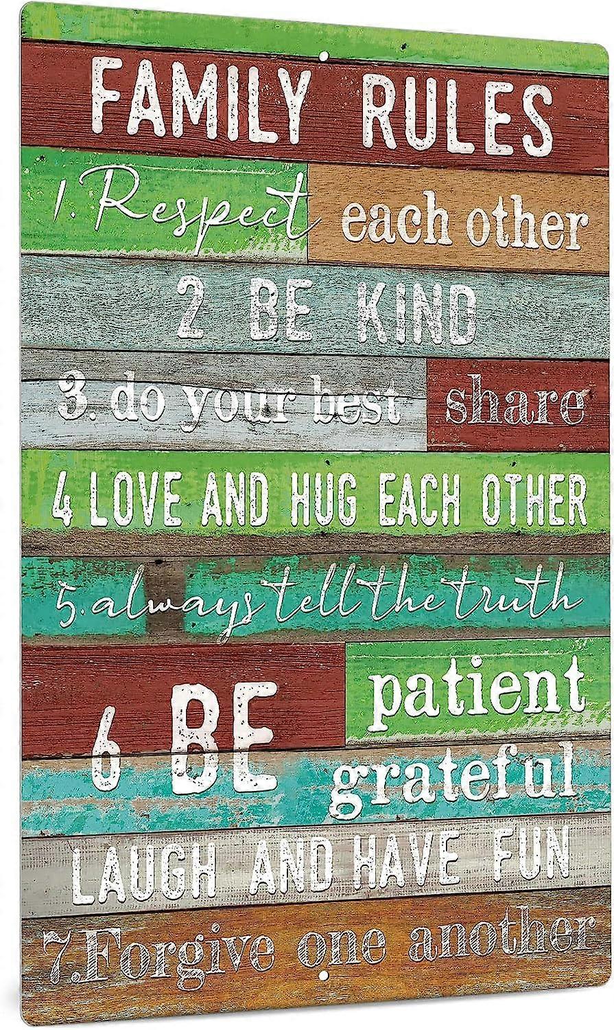 Family Rules Sign, Vintage Wall Art Decorations for Home, Living Room, Kitchen, 12x8 Inches Aluminum Metal Sign - Respect Each Other