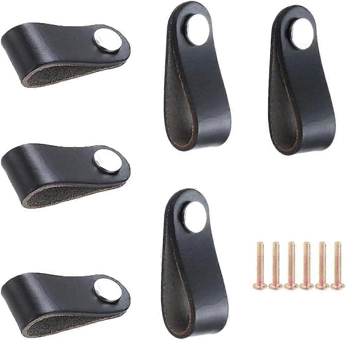 Set of 6 Refined Leather Handles for Bedroom Furniture (Single Hole, Black)