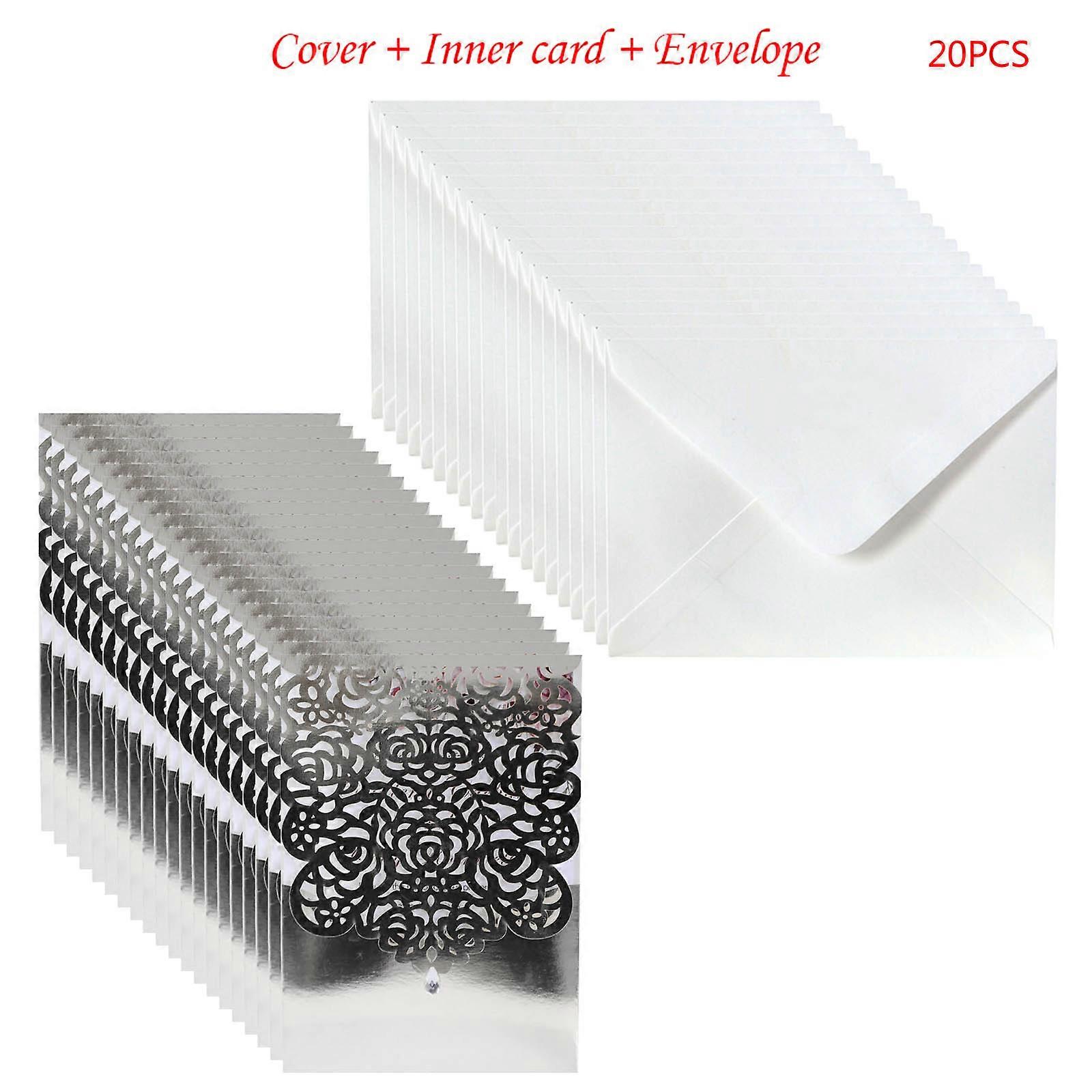 20pcs Wedding Invitations with Envelopes Hollow Lace Rose Pocket Reflective Greeting Card for Bridal Shower Invite Silver