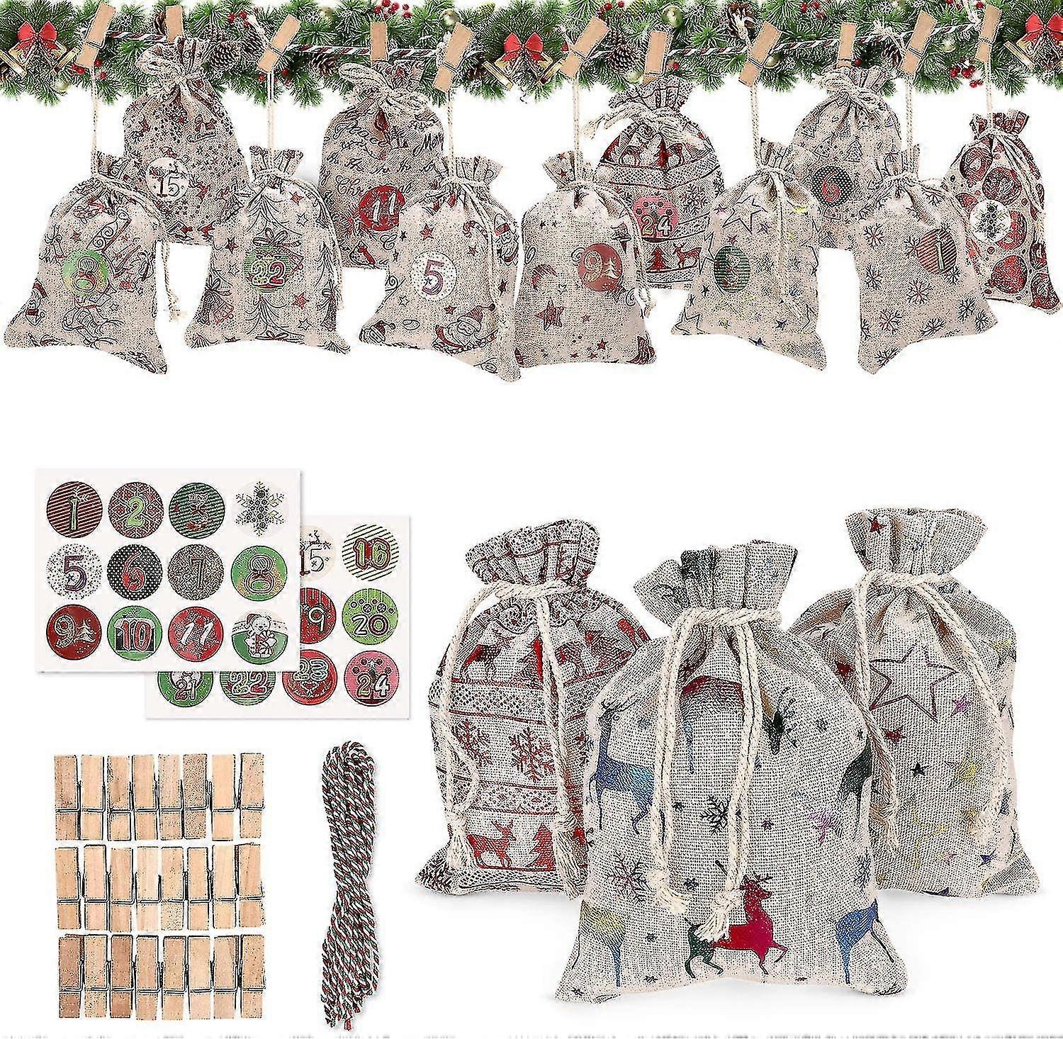 christmas Countdown Calendarour 24 Christmas Calendar Bags Contain 12 Different Patterns, With 24 Number Stickers Which Can Be Easily Disassembled And Glued To The Bag. Children Can Easily Count Down To Christmas By Putting Candy Or Gifts In Their Bags Every Day, Bring A Comfortable Homey Atmosphere To Your Christmas Holidaypremium Materialthe Christmas Advent Calendar Is Made Of High Quality Linen With Sturdy Red, Green And White Lines To Easily Enclose The Gift Bags Securely, Each Bag Measures 10*14cm. Finely Constructed. Quality Craftsmanship Ensures This Calendar Can Be Used Year After Year. It Will Be The Best Choice For Your Christmas Countdownholiday Designsophisticated And Unique Design. This Cute Christmas Advent Calendar Features A Variety Of Classic Christmas Elements, Such As Five-pointed Stars, Hanging Balls, Elk, Snowflakes, Bells, Christmas Stockings, Christmas Trees And Santa Claus. Red And Colored Patterns Enhance The Festive Mood, Perfect For Christmas Home Decorideal Forchristmas Countdown Advent Calendar Is A Perfect Addition To Your Holiday Decorations. You Can Choose To Put A Christmas Gift, Toy Or Treat In Each Pocket, It Will Bring The Fun That Can Be Had With Little Gifts To Be Opened Daily Until The 24th. Great For Hanging On The Wall, Christmas Tree, Door, Wall Or Mantel, Very Eye-catching