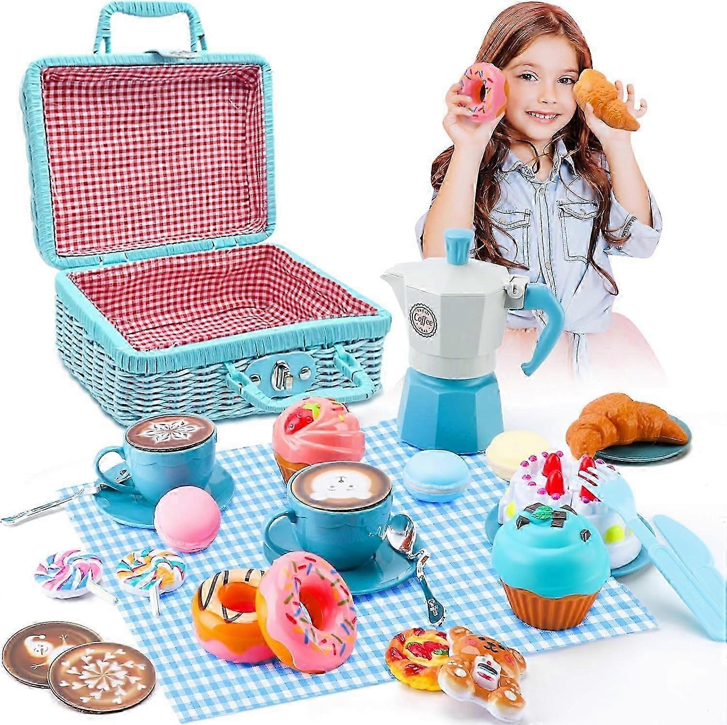 Tea Party Set for Little Girls, 30pcs Picnic Basket Set with Carry Case Teapot Tea Cup Dessert & Table Cloth, Pretend Play Toy Gifts Kids Tea Party Se