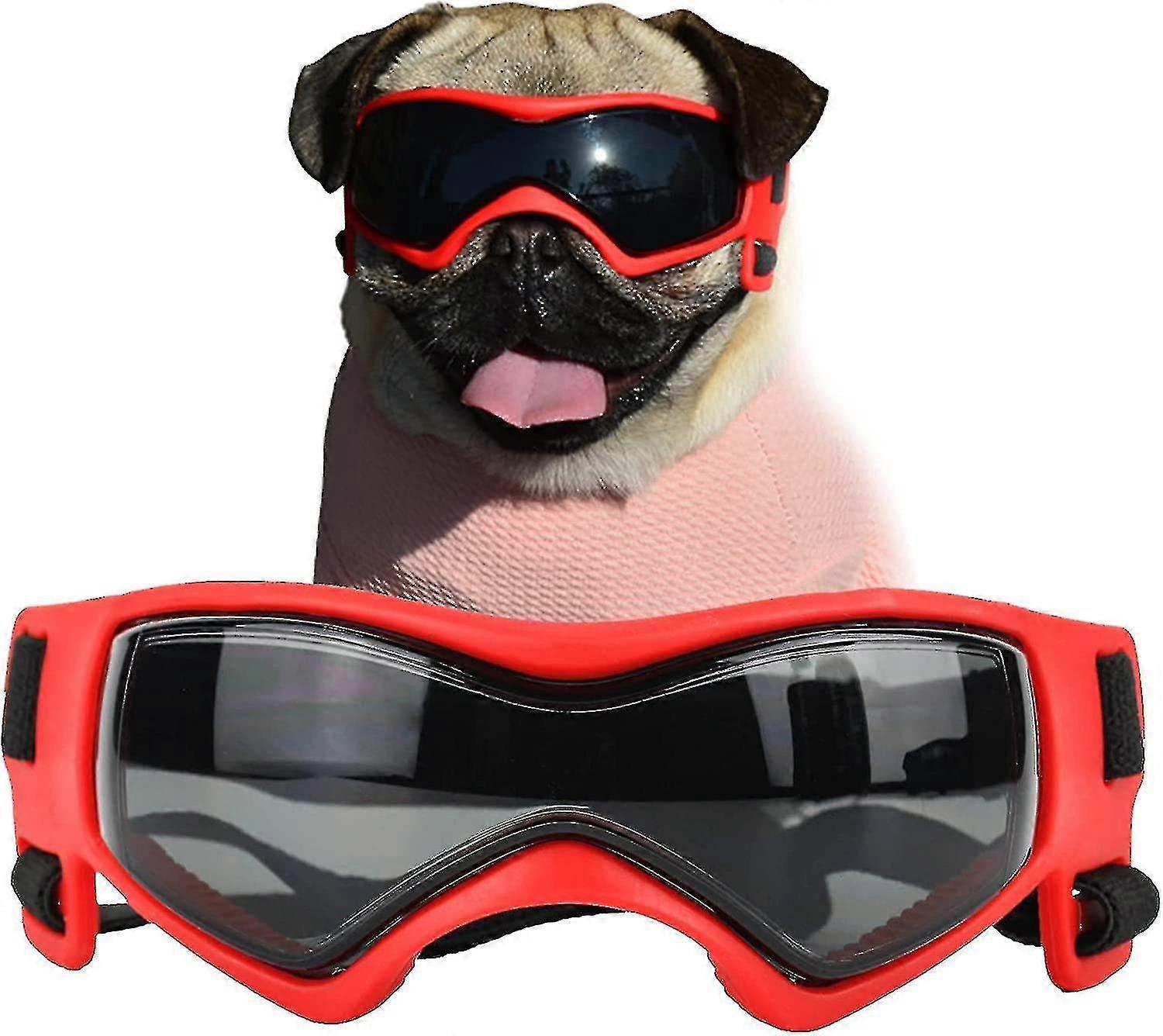 High-quality material: Our dog glasses with a soft TPE frame and 2 adjustable elastic straps. Highly UV resistant. Its suitable for dogs with various face shapes.Small & comfortable dog goggles: Made of soft rubber. Tooth-like rubber vents on the frame of dog glasses. Dog feel comfortable. On the lens of dog sunglasses without water mist.Curved design lenses: Suitable for dogs with any face shapes. Our dog glasses designed with special curved lenses, to make dog goggles comfortable with your dog's face.Easy to wear: Dog goggles come with 2 adjustable elastic bands. It is very easy to adjust and wear. It is suitable for most small and medium-sized dogs.Pet goggles for driving: Dogs like to stick their heads out of the car window. Dog sunglasses can prevent some small stones or other things from hitting the dog's eyes.Dog winter ski goggles: In winter, there are also strong sunlight. Dog glasses can be used when your dog are skiing. It can block UV in winter and prevent snow from entering your dog's eyes.Dog summer sunglasses: Dog sunglasses can effectively prevent ultraviolet rays and direct sunlight in summer. You can go for a ride outdoors with your pet dog and enjoy the summer sun.Size: Length: 8. Width: 2. Adjustable head strap: 13.5-18. Adjustable chin elastic straps: 6-9. Perfect for dogs small to medium like Corgi / Pomeranian / Boston Terrier / Pitbull / Chihuahuas. etc.