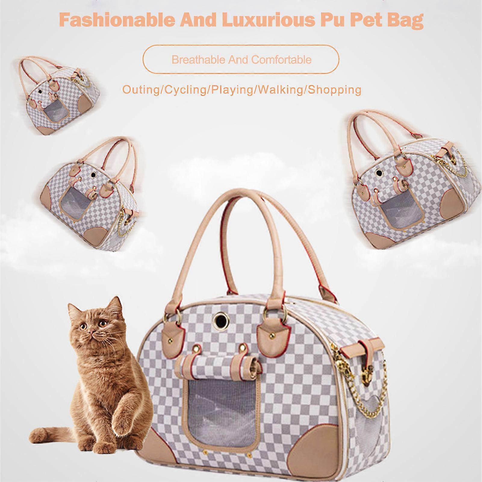 Feature: 1. High-quality PU leather, fashionable and durable, does not fade or deform. 2. Breathable and comfortable, the mesh panels and side zip pockets are convenient and practical. 3. Foldable and sturdy, it has a hard-sided construction with comfortable soft padding. Specification: Fashionable and luxurious PU leather dog travel bag, breathable and comfortable, foldable and sturdy, suitable for small dogs, it is the best choice for traveling with your pet. Features: High-quality PU leather, fashionable and durable, does not fade or deform. Breathable and comfortable, the mesh panels and side zip pockets are convenient and practical. Foldable and sturdy, it has a hard-sided construction with comfortable soft padding. Internal fixed leash prevents pets from escaping, keeping your pet safe and comfortable. Suitable for pets under 8 pounds, it is your best companion when traveling with small dogs or cats. Specifications: Material: High quality PU leather Interior: Comfortably padded (removable panels for easy cleaning) Color: brown, white checkered(Optional) Size: L with window / S without window(Optional) L:42* 29*18cm/16.5*11.8*7.5in S: 38*H23*17cm/15.5*9.8*6.7in Weight: L: about 1300g/32.6oz S: about 1000g/28.3oz Package list: 1*Pet carrier bag Package List: 1*Pet carrier bag