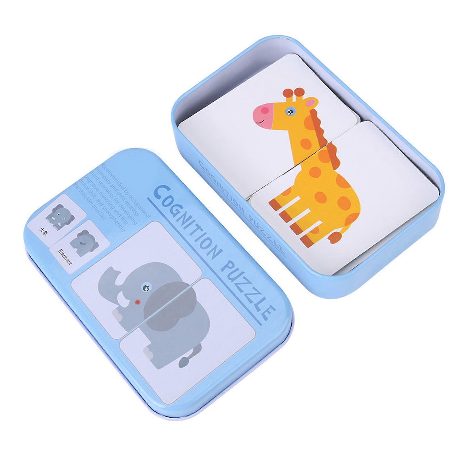 Preschool Cognitive Learning Training Puzzle Cards Baby Educational Toy With Iron Box Animals Description: This is an matching card set, which is a great educational toy for your baby. The cards are made by paper material, non-toxic and eco-friendly, safe and durable e, not easy to shred or break. Vivid cartoon pattern design and bright color, it can bring great fun to your kid. Features: The cards are made by paper material, non-toxic and eco-friendly, safe and durable e, not easy to shred or break.  Vivid cartoon pattern design and bright color attractive baby's attention greatly, it can bring great fun to your kid. Equipped with exquisite iron box for convenient carrying and storage. Simple match can improve baby cognitive ability, train hand-eye coordination skills and expand knowledge. A cute teaching aids to teach baby English words and shape of  fruit animal traffic. Also great for parent-child interaction. Specification: Condition: Material: Iron + Paper Color: As the Picture Show Quantity: 32Pcs/Box Suitable for: Baby ages 0-3 years Card Size: Approx. 75 x 55mm / 2.95 x 2.17inch Weight: Approx. 152-154g   Package Included: 1 x Set of 32Pcs Baby Learning Cards (With a Iron Box) Note: Please allow slight deviation for the color and measurement. Thanks for your understanding. Please note that English and Chinese are printed on this product.
