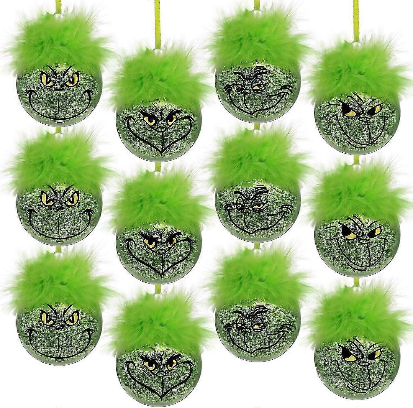 Christmas Decorations Indoor: 12pcs Cute Grinchmas Christmas Tree Ornaments with Fuzzy Green Hair, Glitter Hanging Grinchmas Xmas Balls for Tree Firep